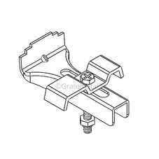 Installation: Lower the assembled grating fixing clamp from above the grating surface so that the saddle clamp sits on the top of the grating bars, slide the bottom clamp towards the beam flange of base structure & fasten the bolt from the top by using simple hand tools. The square nut locks tightly in the slot of the bottom clamp which allows easy fastening of the grating fixing clamp from above.